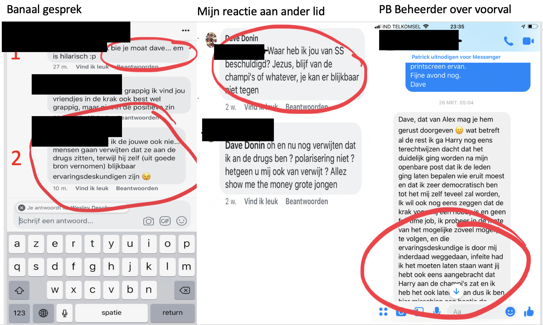 Toch zag de beheerder van de groep (rechts) in kwestie wel onmiddellijk het verband tussen mijn naam, in de ene reactie, met de verwijzing naar mijn reactie ivm drugs aan een ander lid in de tweede ( boven midden) Net als andere leden, trouwens.