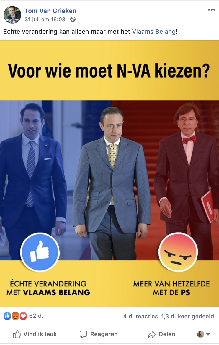 Tom Van Grieken weet dat zijn aanhang zich die vraag niet stelt, wat Di Rupo in Vlaamse regeringsdeelname komt doen en bijna met een dwangmatige reflex op de like zal duwen (één click is genoeg).
