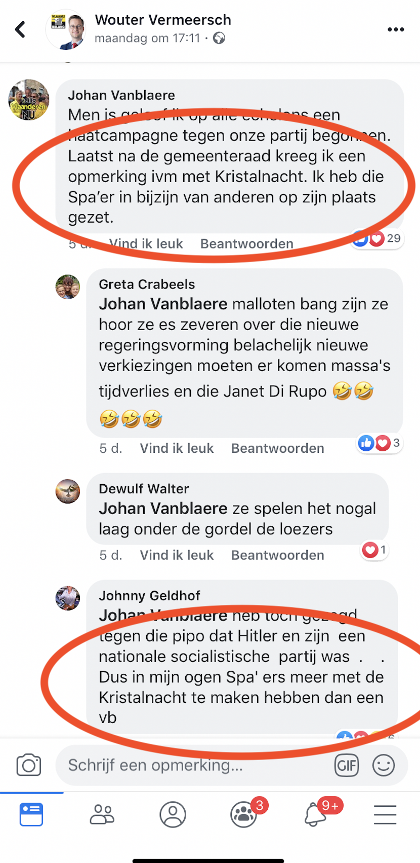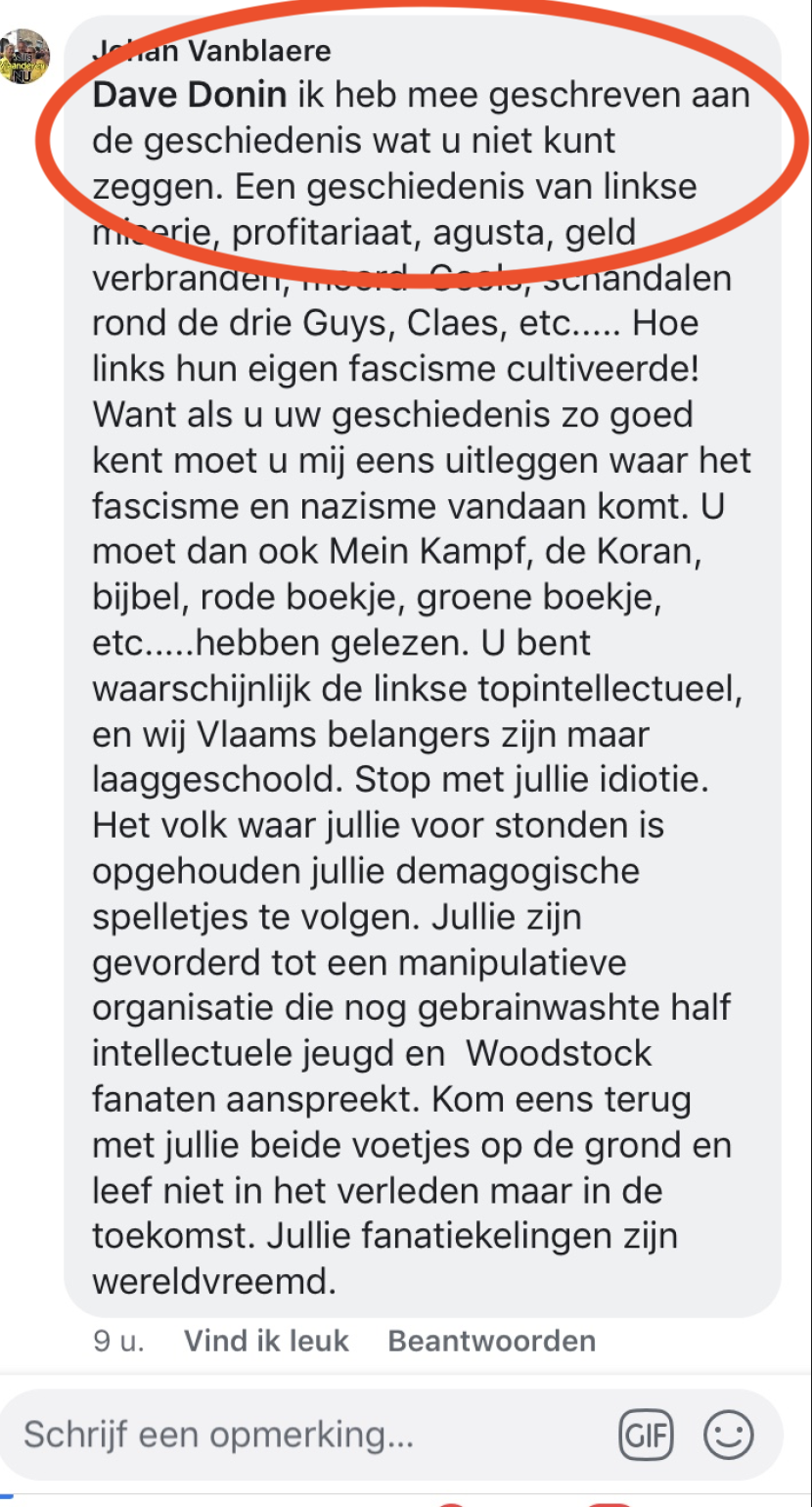 Ik was een tijdje lid van een groep op FB, waarin VB’ers en NVA’ers de plak zwaaien (lees het luidst roepen) en waar ik het een aantal keer aan de stok kreeg met een verkozen Vlaams Belanger uit Oostende.