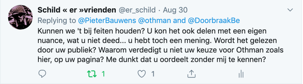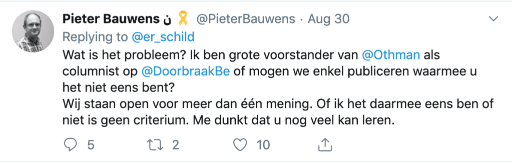 Ik kaartte aan dat Othman zijn deftig geschreven stuk amper zou worden gelezen, dat hij bakken kritiek moest slikken en het werd afgedaan als extreem linkse propaganda… en u het ook niet nodig vond Othman te verdedigen tegen deze aanvallen op uw eigen site en pagina. (Doorbraak)